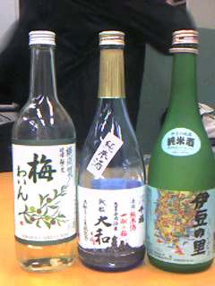 左から、横須賀の白ワイン「梅わいん」(※)・広島土産の純米酒「大和」・熱海土産の純米酒「伊豆の里」です。